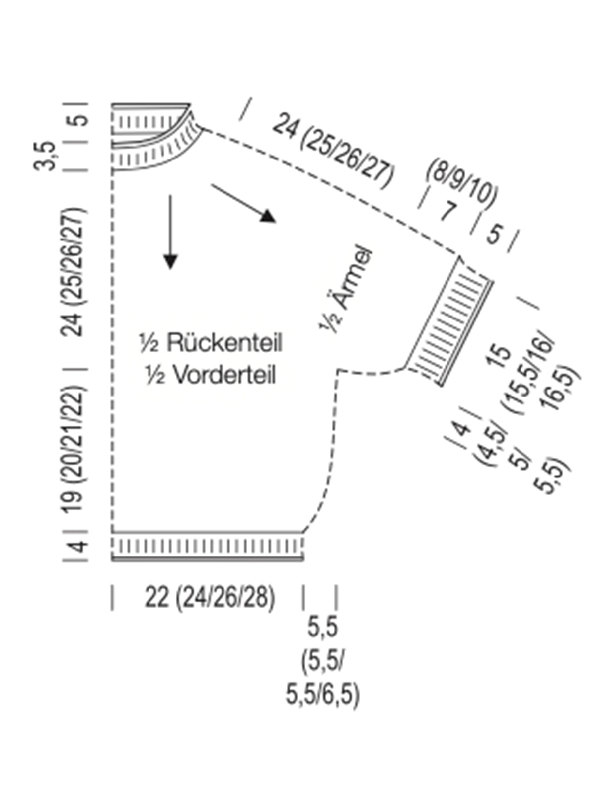 Dieser Pullover hat kurze Ärmel und wird nahtlos von oben nach unten in Runden gestrickt.