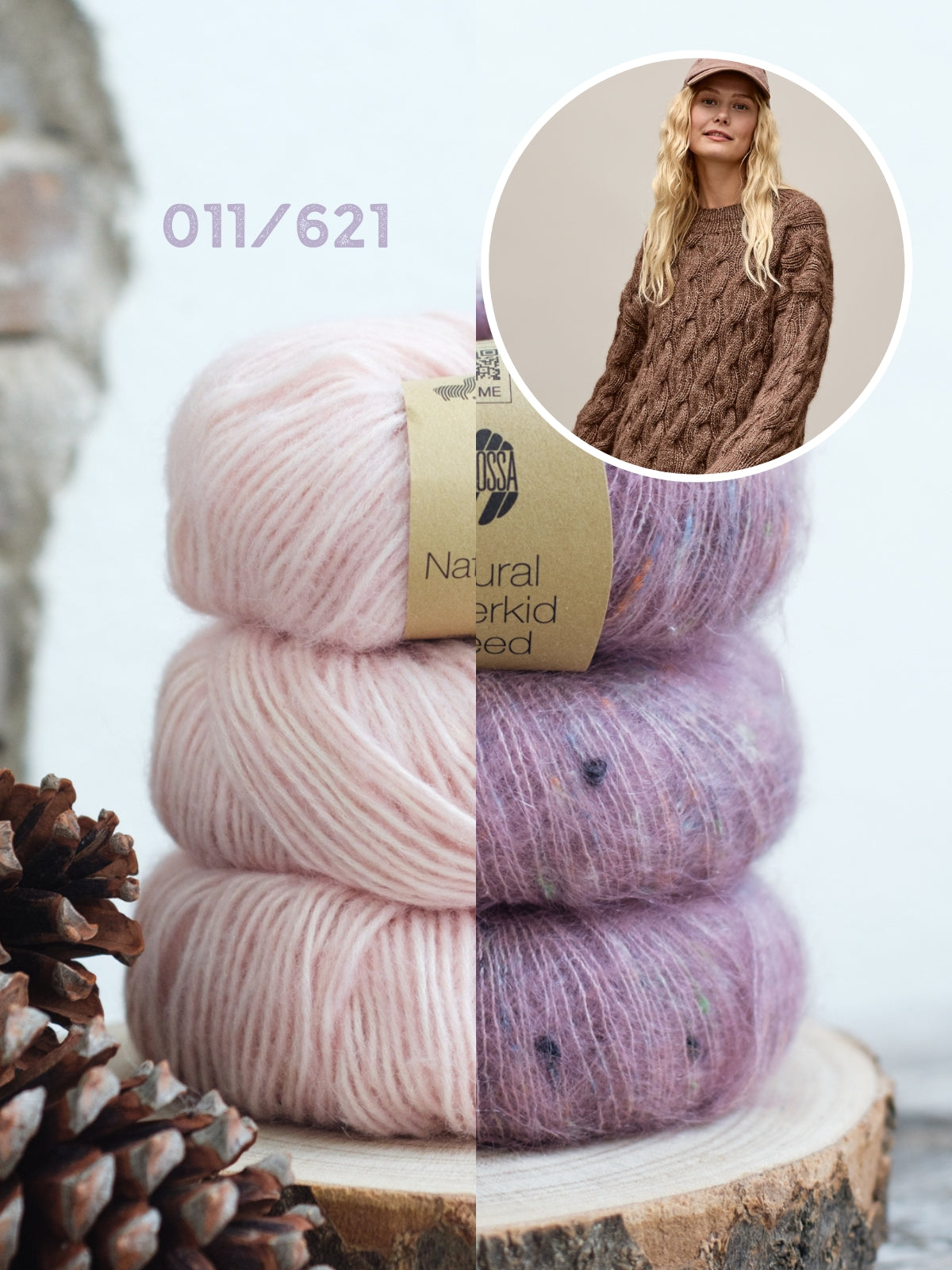 Material: Lana Grossa Natural Alpaca Pelo (63 % Baumwolle, 31 % Alpaka (Baby), 6 % Schurwolle (Merino); Lauflänge = 125 m / 50 g): 550 (600 / 650 / 700) g Dunkelbraun meliert (Fb. 8) und Lana Grossa Natural Superkid Tweed (60 % Mohair (Superkid), 30 % Seide, 7 % Baumwolle, 3 % Polyester; Lauflänge = 200 m/25 g): 175 (175 / 200 / 225) g Nougat (Fb. 637); je eine Rundstricknadel 4 mm und 6 mm, 80 – 100 cm lang (Rd mit geringerem Umfang mit der Magic-Loop-Methode oder einer zusätzlichen kurzen Rundstricknadel 4 mm und 6 mm arbeiten); Zopfnadel.
