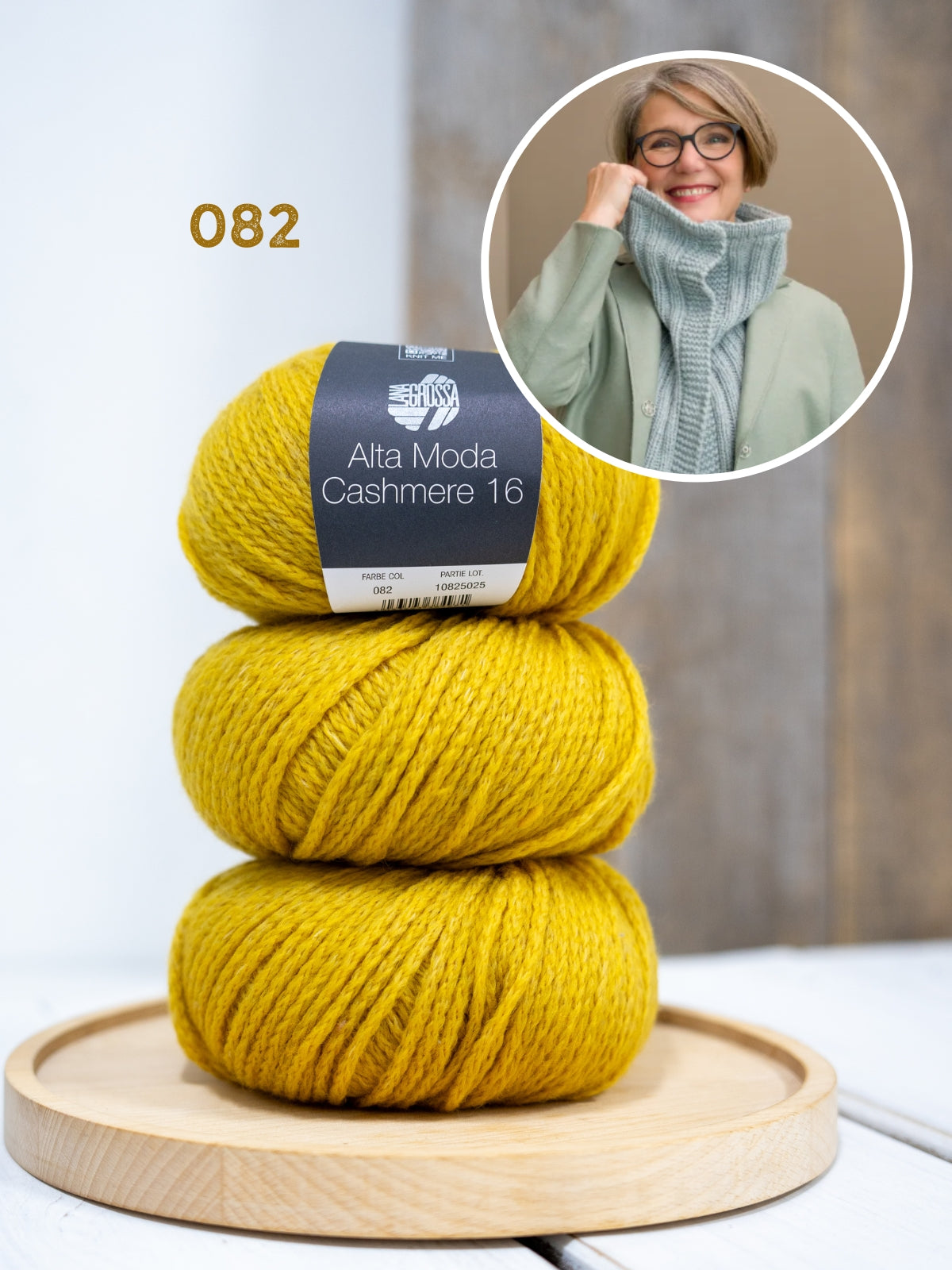 Der Loop wird mit Alta Moda Cashmere 16 gestrickt. Dieses Garn besteht aus 78 % Merinowolle, 12 % Kaschmir und 10 % Polyamid. Der Loop hat einen Umfang von ca. 60 cm und wird etwa 50–55 cm lang.