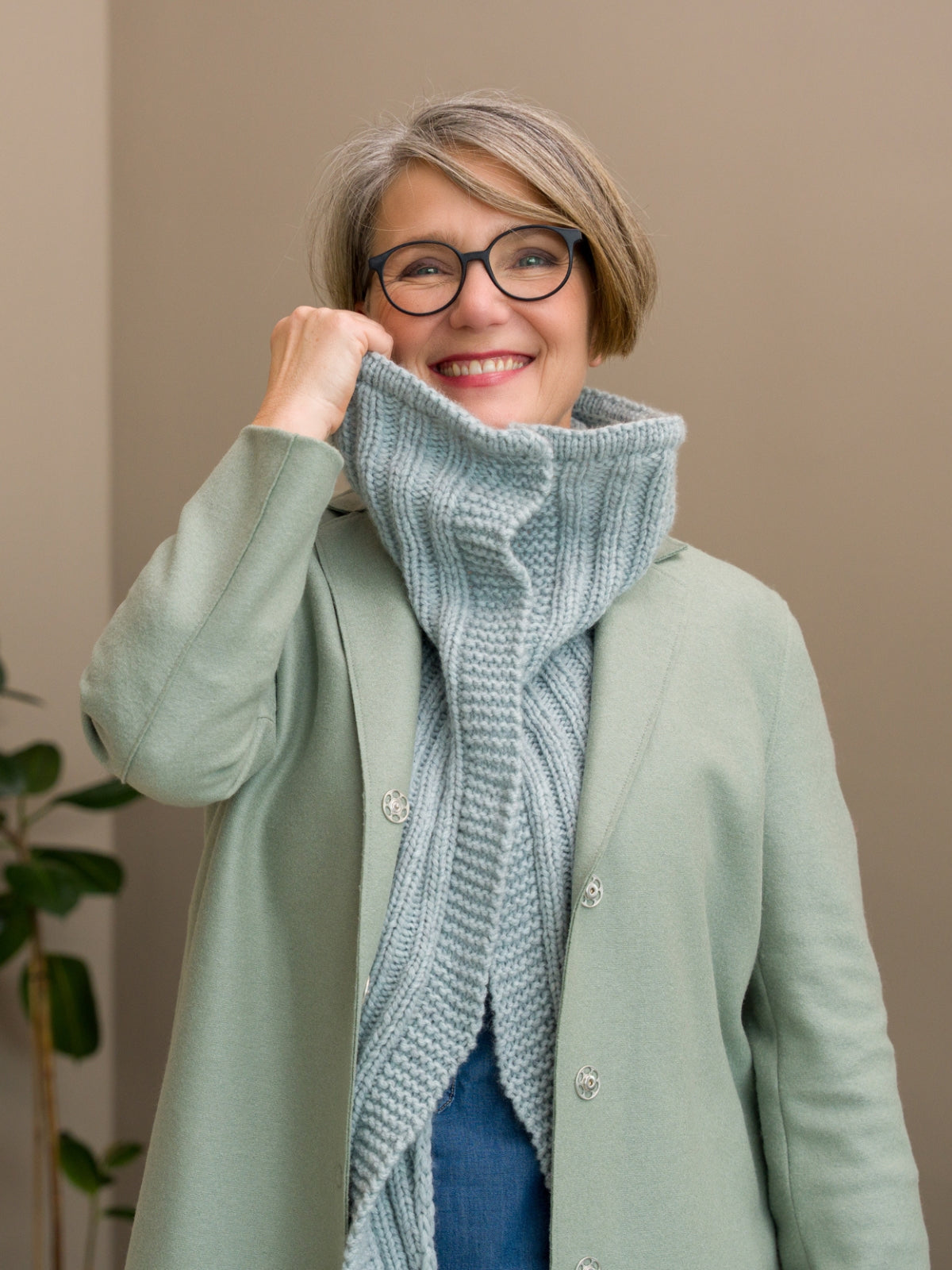 Tanja ist bestens auf kaltes Wetter vorbereitet – mit diesem neuen Schal! Durch die besondere Form bleibt Ihr Hals wunderbar warm und Sie haben zudem etwas zusätzliche Wärme unter der Jacke. Sie beginnen oben mit einem doppelt gestrickten Bündchen, durch das Sie später optional eine Kordel einziehen können, um die Weite individuell anzupassen. Anschließend wird nach unten gearbeitet, bis zwei Spitzen entstehen. Tanja hat den Schal für die Fernsehsendung „Kaffee oder Tee“ entworfen – mehr darüber können Sie auf ihrem Blog lesen.