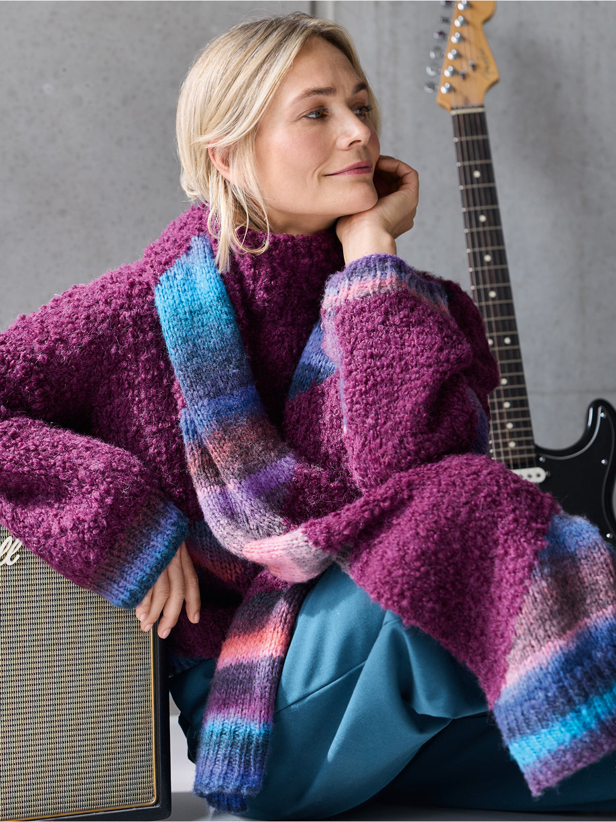 Material: Lana Grossa-Qualität „Orsetto” (60 % Schurwolle (Merino), 40 % Alpaka (superfine), LL = ca. 75 m/50 g): ca. 150 g Burgund (Fb. 5) und Lana Grossa-Qualität „Bomba” (85 % Schurwolle (Merino extrafine), 15 % Polyamid, LL = ca. 290 m/100 g): ca. 100 g Lachs/Graurot/Dunkelviolett/Türkisblau/Blaupetrol/Royal (Fb. 3); Stricknadeln Nr. 4 und 6.