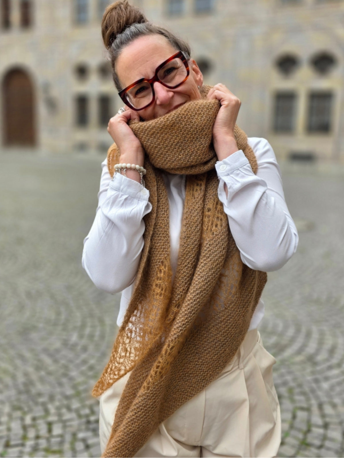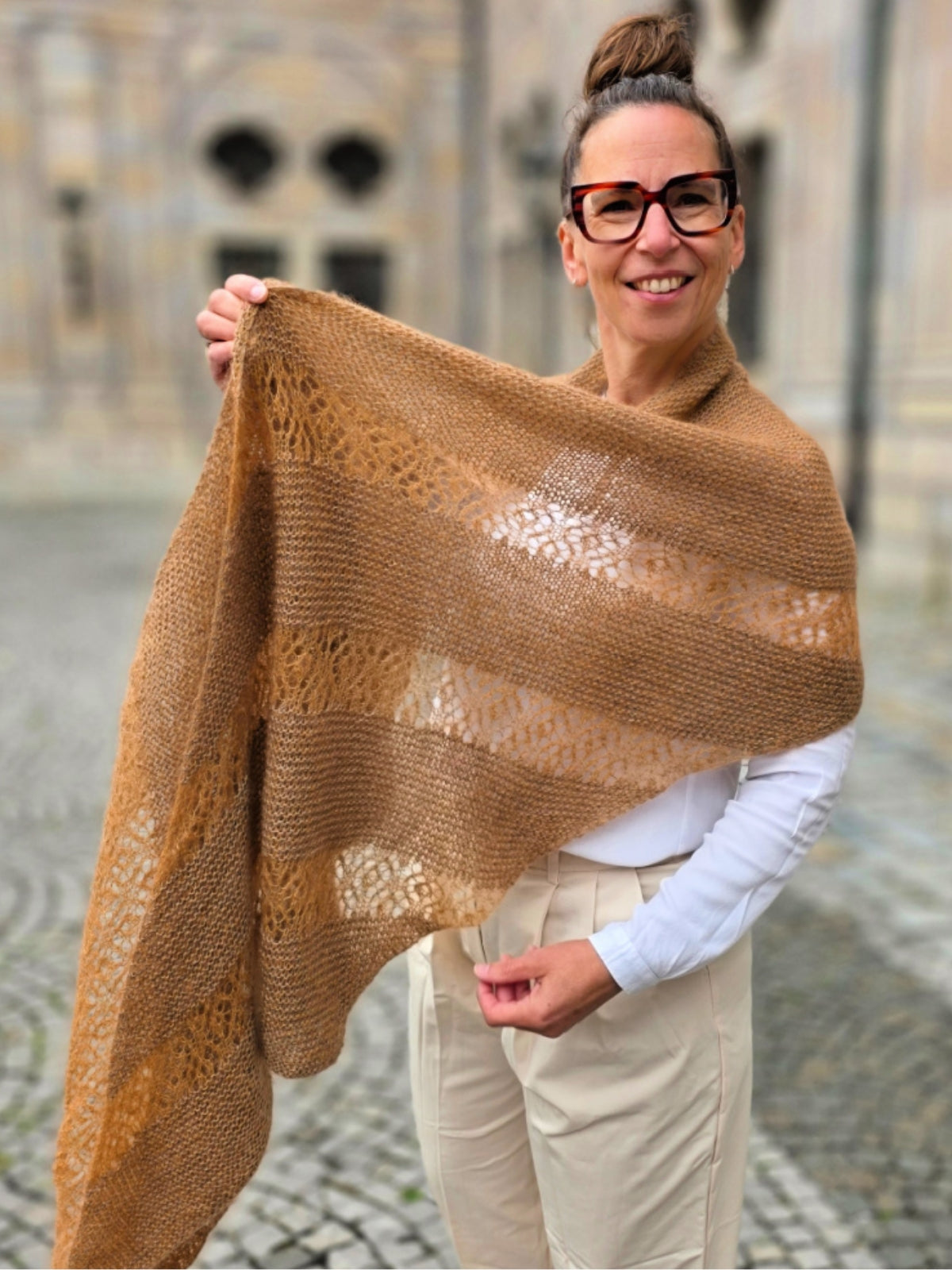 Dies ist ein gerader Schal, in den ein wunderschönes Ajourmuster eingestrickt wird. Außerdem wechseln sich glatt rechts und kraus rechts ab, was für eine schöne Texturvariation sorgt.