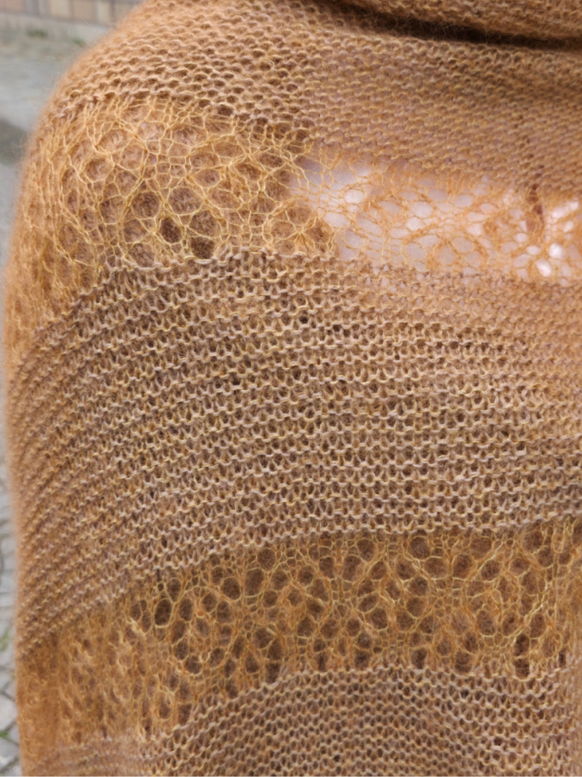 Die Stola wird mit Cool Wool Lace (100 % Merinowolle) und Silkhair (70 % Kidmohair, 30 % Seide) gestrickt. Der Schal wird ca. 190 cm lang und 30 cm breit.