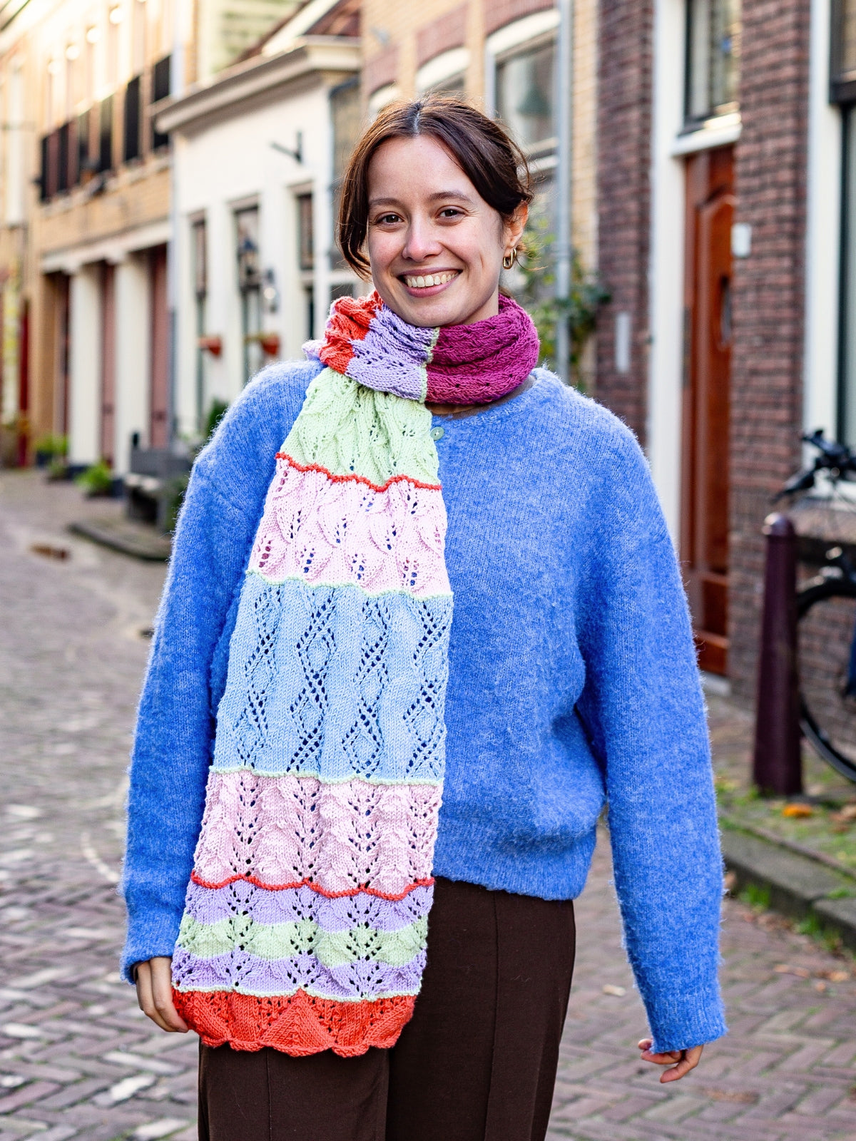 Dieser fröhliche Schal ist eine Variation unseres Stitch Party KAL vom vergangenen Jahr. Statt eines großen dreieckigen Tuchs handelt es sich dieses Mal um einen geraden Schal, der aus verschiedenen Ajourmustern besteht. Einige Muster des letzten Jahres kehren zurück, aber es sind auch neue Musterabschnitte enthalten. In unserem Blog finden Sie alle Informationen zu diesem KAL.