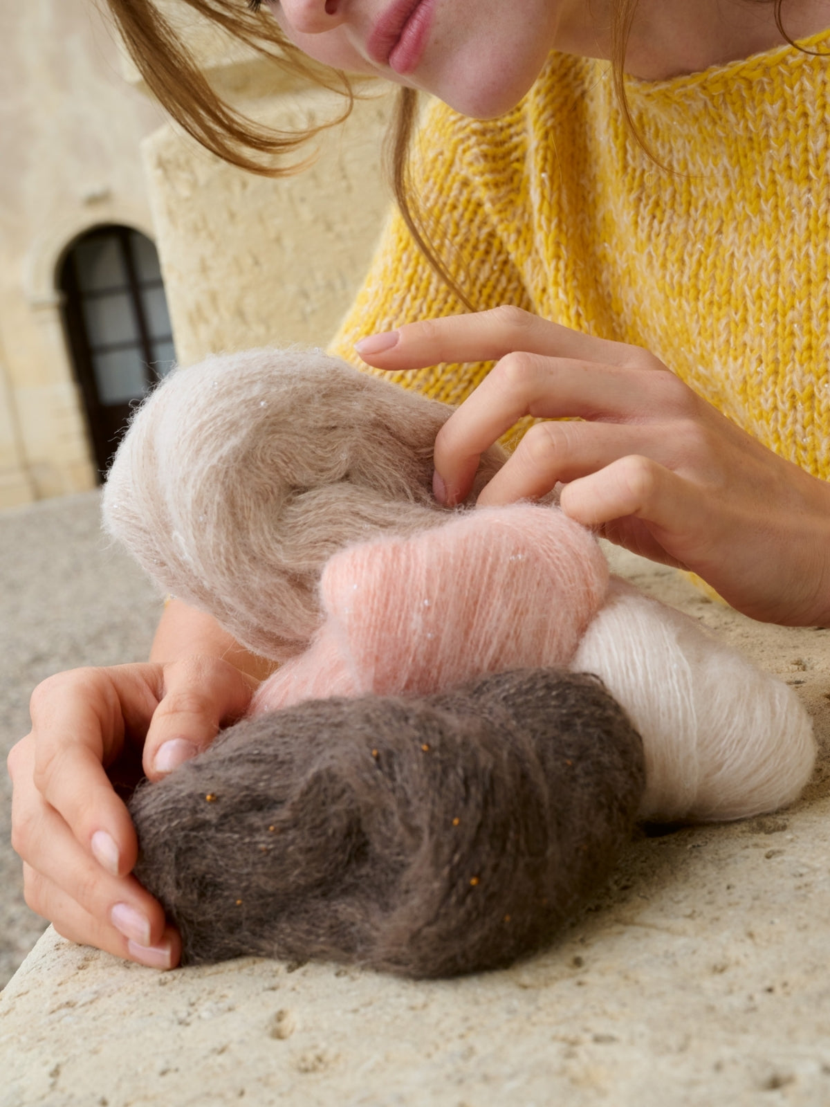 Material: Lana Grossa-Qualität „Summer Softness“ (80 % Baumwolle (Bio), 20 % Schurwolle (Merino superfine), LL = ca 130 m/50 g): ca 250 (300 - 350 - 400) g Dottergelb (Fb 21); Lana Grossa-Qualität „Setasuri Pearls“ (50 % Alpaka (Suri), 22 % Seide, 16 % Baumwolle, 12 % Glas, LL = ca 140 m/25 g): ca 75 (100 - 100 - 125) g Hellbeige (Fb 201); kurze und lange Rundstricknadel Nr 7; Maschenmarkierer.