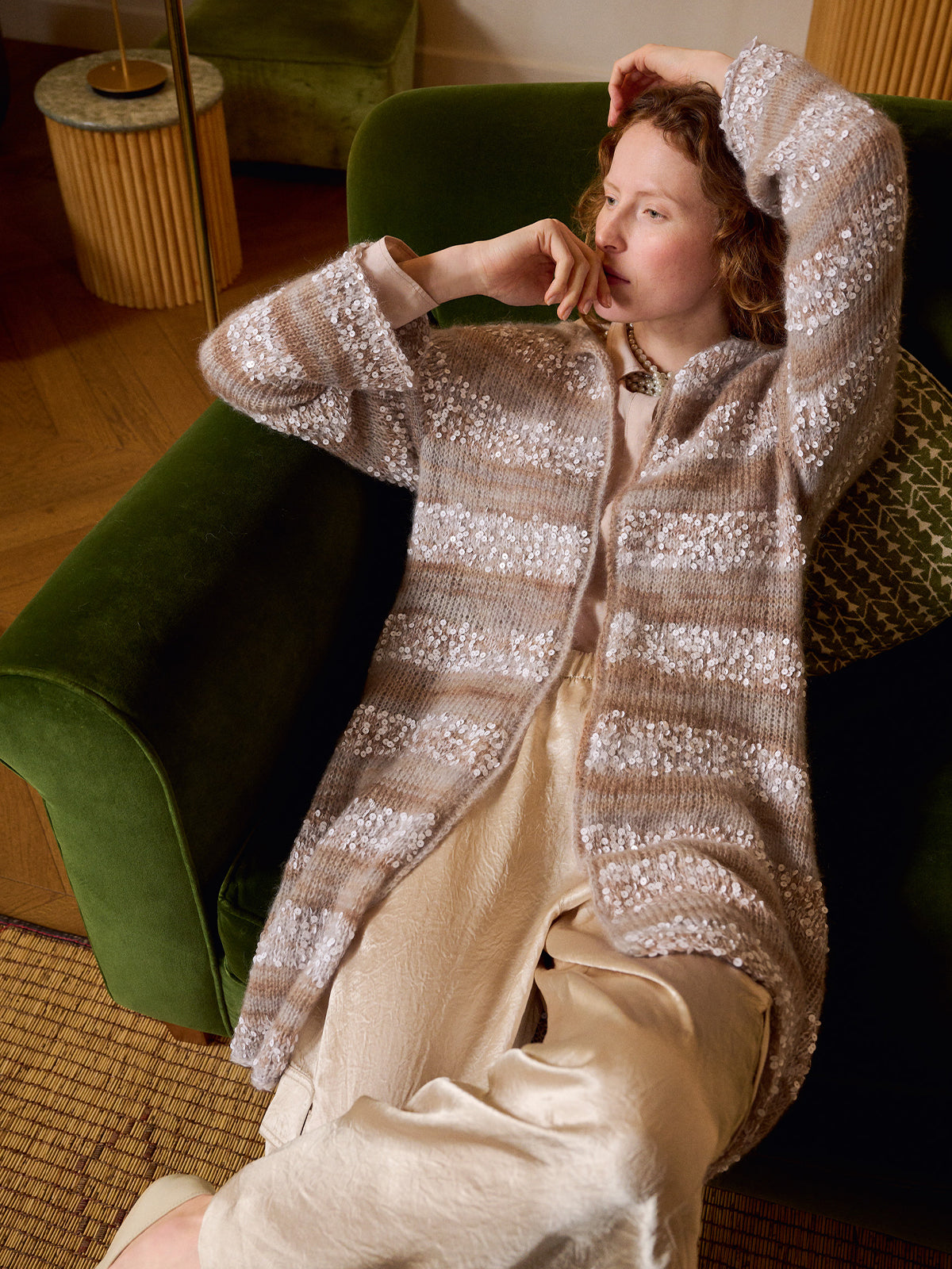 Ein schlichtes Modell, mit dem Sie dank der Pailletten dennoch alle Blicke auf sich ziehen! Die Jacke wird nahtlos von oben nach unten gestrickt.