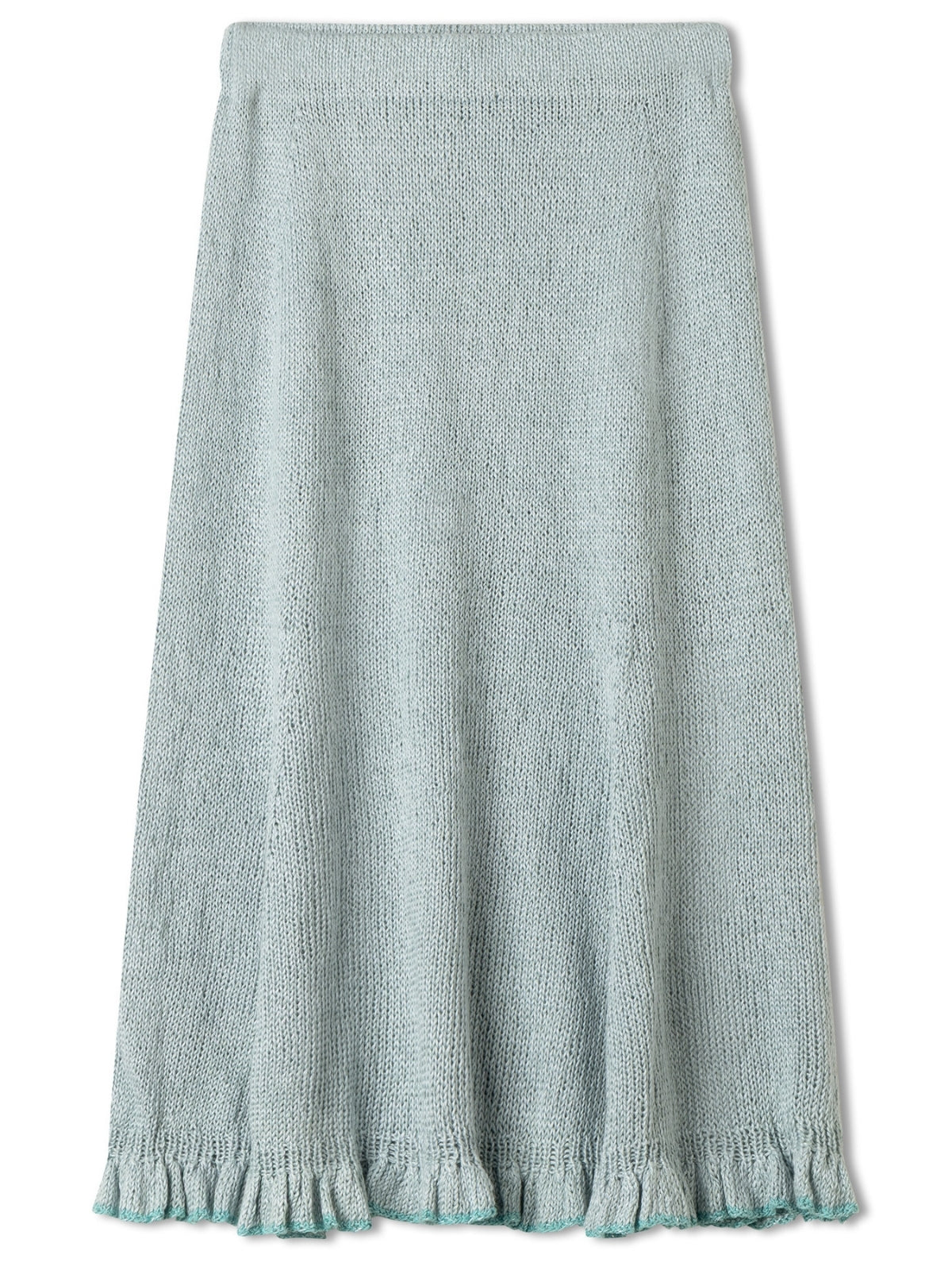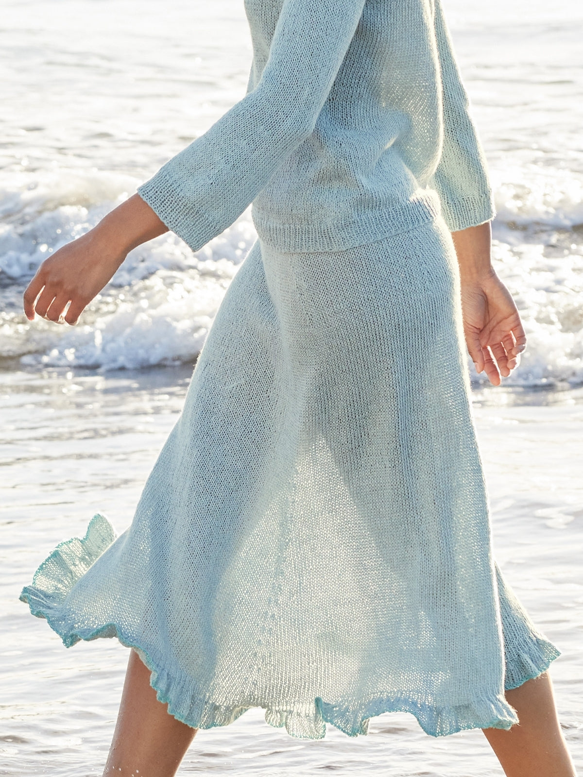 Material: Lana Grossa Tencellino (51% Leinen, 49% Tencel, LL = ca. 125 m/50 g), 450 (500 - 550) g in Eisblau (Fb 9). Lana Grossa Filo Paillettes (55% Baumwolle, 39% Polyester, 6% Polyamid, LL = ca. 155 m/50 g), 50 g in Türkis (Fb 11). Je eine 80 cm lange sowie 120 cm oder 150 cm lange Rundstricknd Nr. 3,5 und Nr. 4. 10 MM. Ca. 75 (85 - 95) cm Gummiband, 4 cm breit.