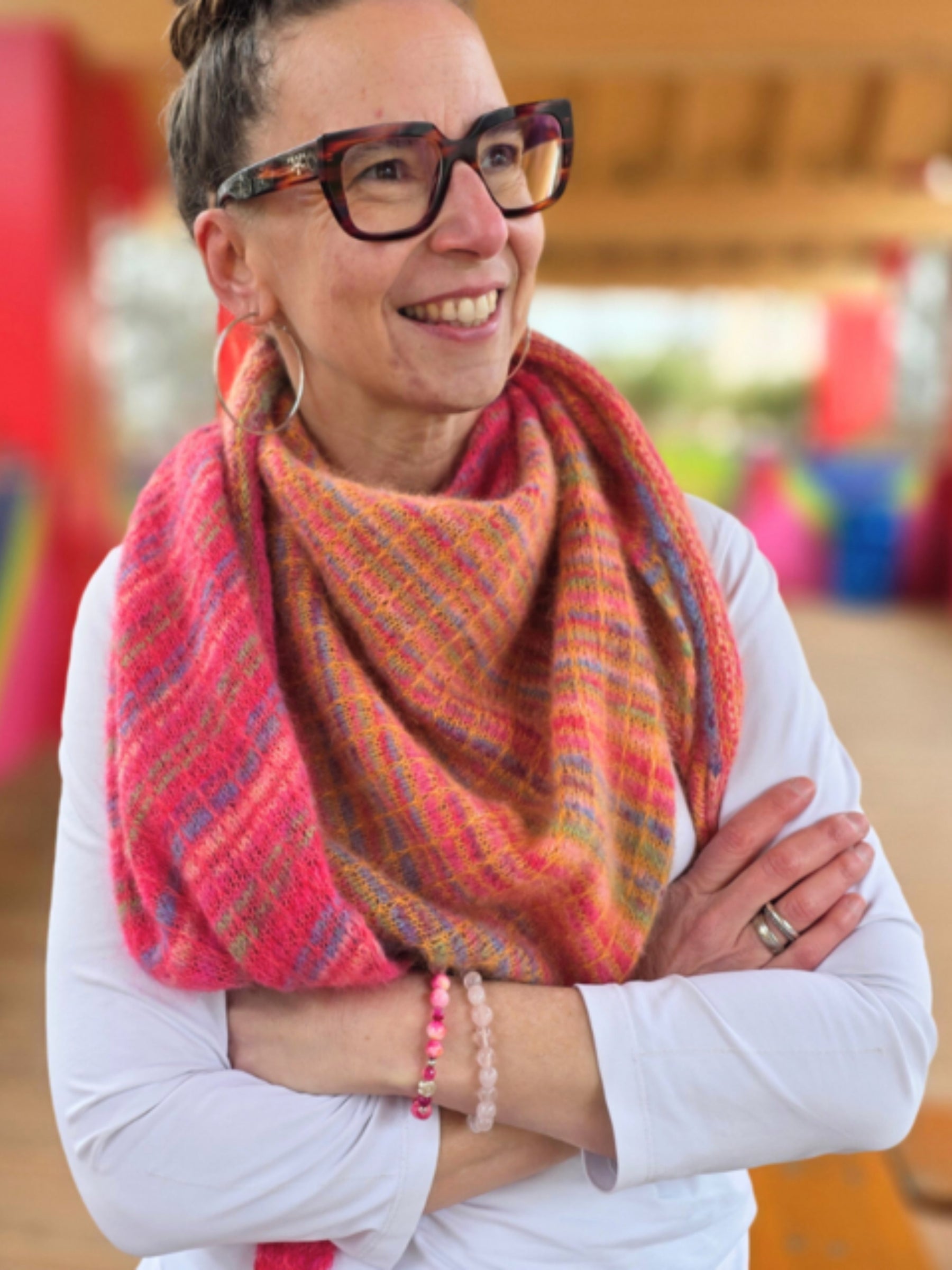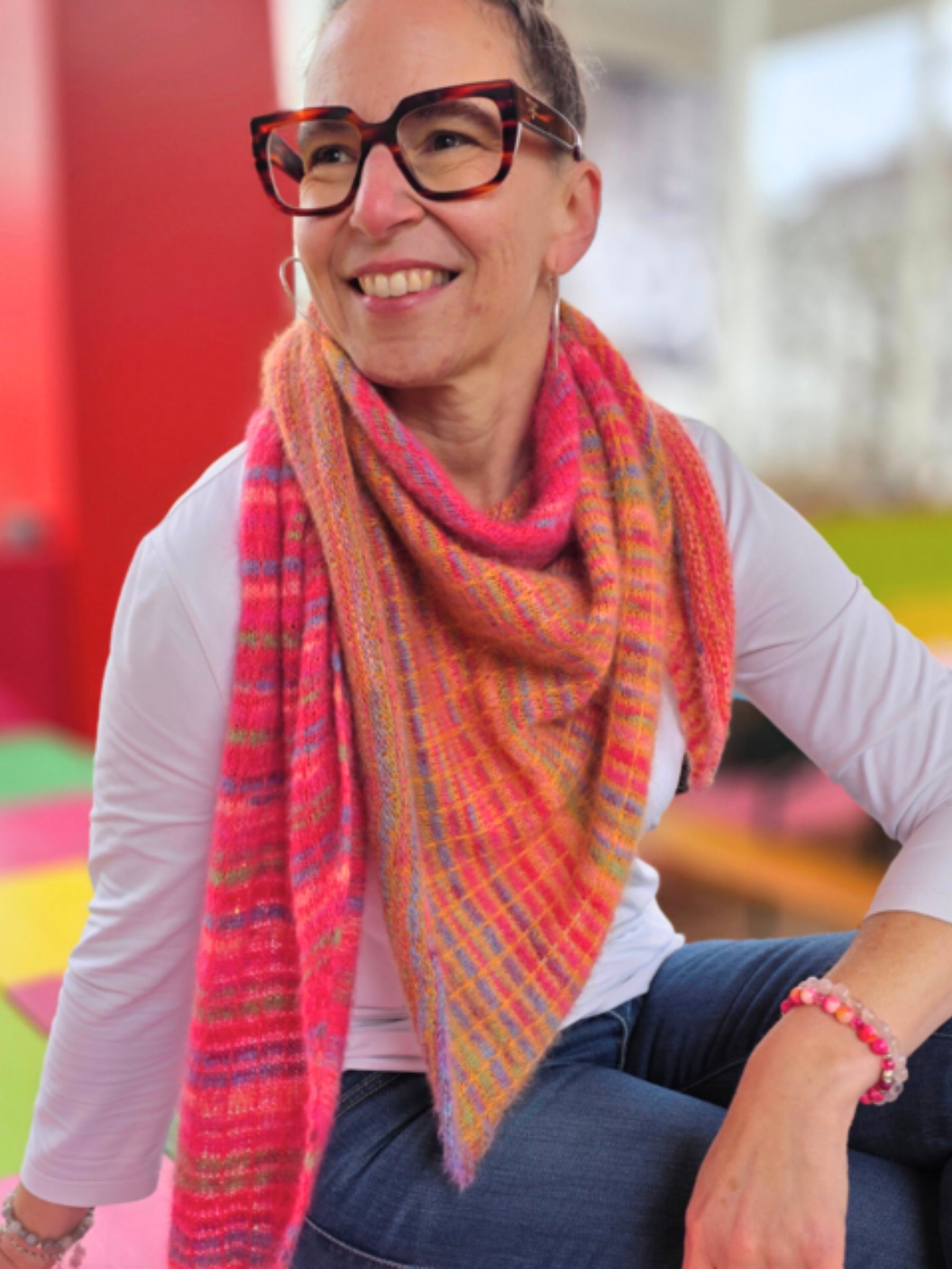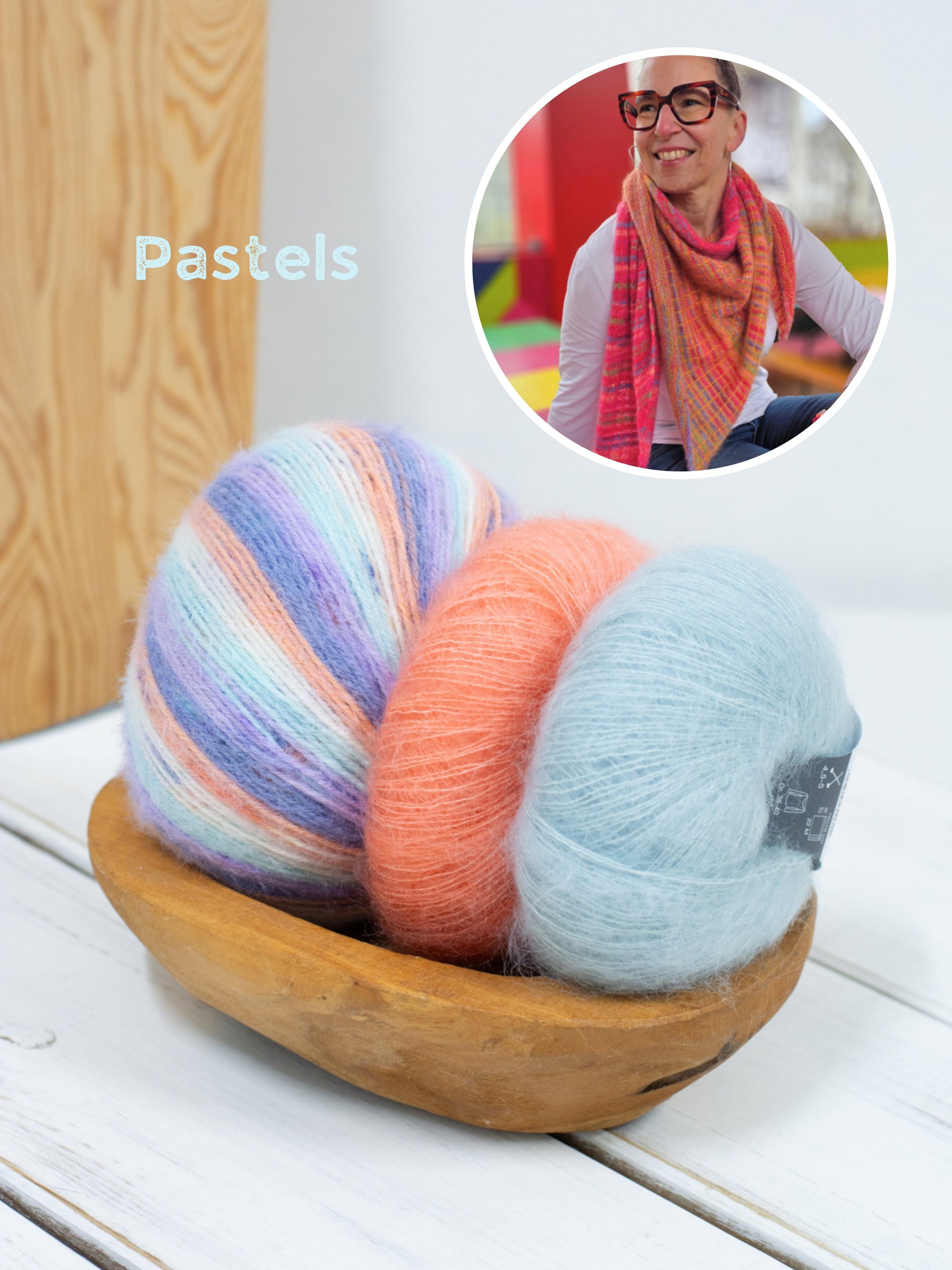 Dieses dreieckige Tuch ist ein echtes Highlight. Die fröhliche Cosy Socks Stripes wird mit zwei verschiedenen Farben Silkhair gestreift. Abgeschlossen wird das Tuch mit einer I-Cord-Kante.